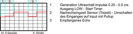 Das Modul wird mit einem freien Portpin eines Mikrocontrollers verbunden. Die Generation des Ultraschall-Pulses erfolgt mit fallender Flanke am Prozessorpin. Das Modul erzeugt für die Zeitdauer der LOW-Phase die 40 KHz Sende-Impulse. Im Anschluss daran muss der Port auf Eingang geschaltet werden (Pull-UP), das Modul antwortet bei empfangenem ECHO wieder mit einem LOW-Puls.