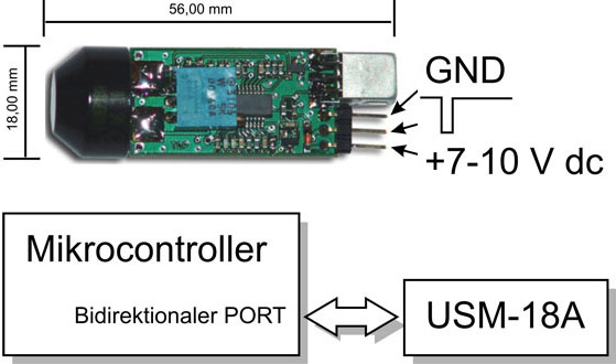 Beim Ultraschallmodul USM-18A handelt es sich um ein hochintegriertes Ultraschall-Modul, das auf engstem Raum sowohl die komplette Ansteuerung eines Ultraschall-Sensors als auch die komplette Signalaufbereitung und -Verstärkung in sich vereint. Die Besonderheit: als Sensor dient ein wasserdichtes Ultrschallelement, um die Messung auch in ungünstiger Umgebung durchzuführen.