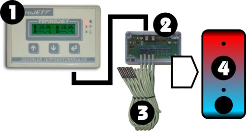 Das Grundsystem besteht aus der Anzeigeeinheit (1), dem Sensorverteiler (2) und den Sensoren (3). Das Messobjekt stellt (4) dar.